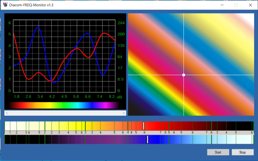To operate with the Diacom-Lite-FREQ and Diacom-SOLO-NLS devices, our company has developed a program for monitoring low-frequency electromagnetic and geomagnetic oscillations available in the range of the device. This program is very simple to apply and has only two windows, one of which shows a spectral oscillation graph showing the registration of resonant frequencies and their spectral type, and the second shows a spectral ruler with projection of the mass of resonant frequencies recorded using the device. The program is intended for subsequent evaluation of the state of energy activity of the environment, which appeared to be in the area of accessibility of the scanning inductive head of the bio magnetic detector.